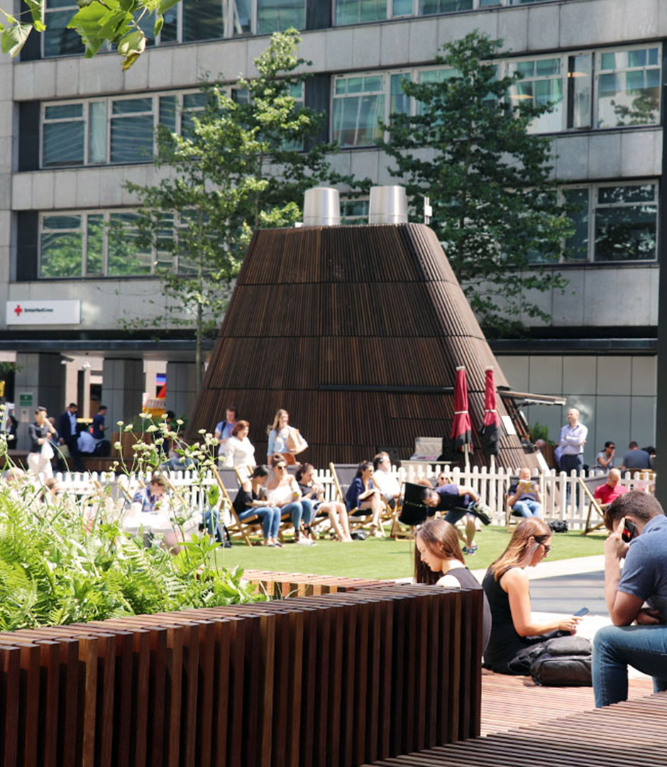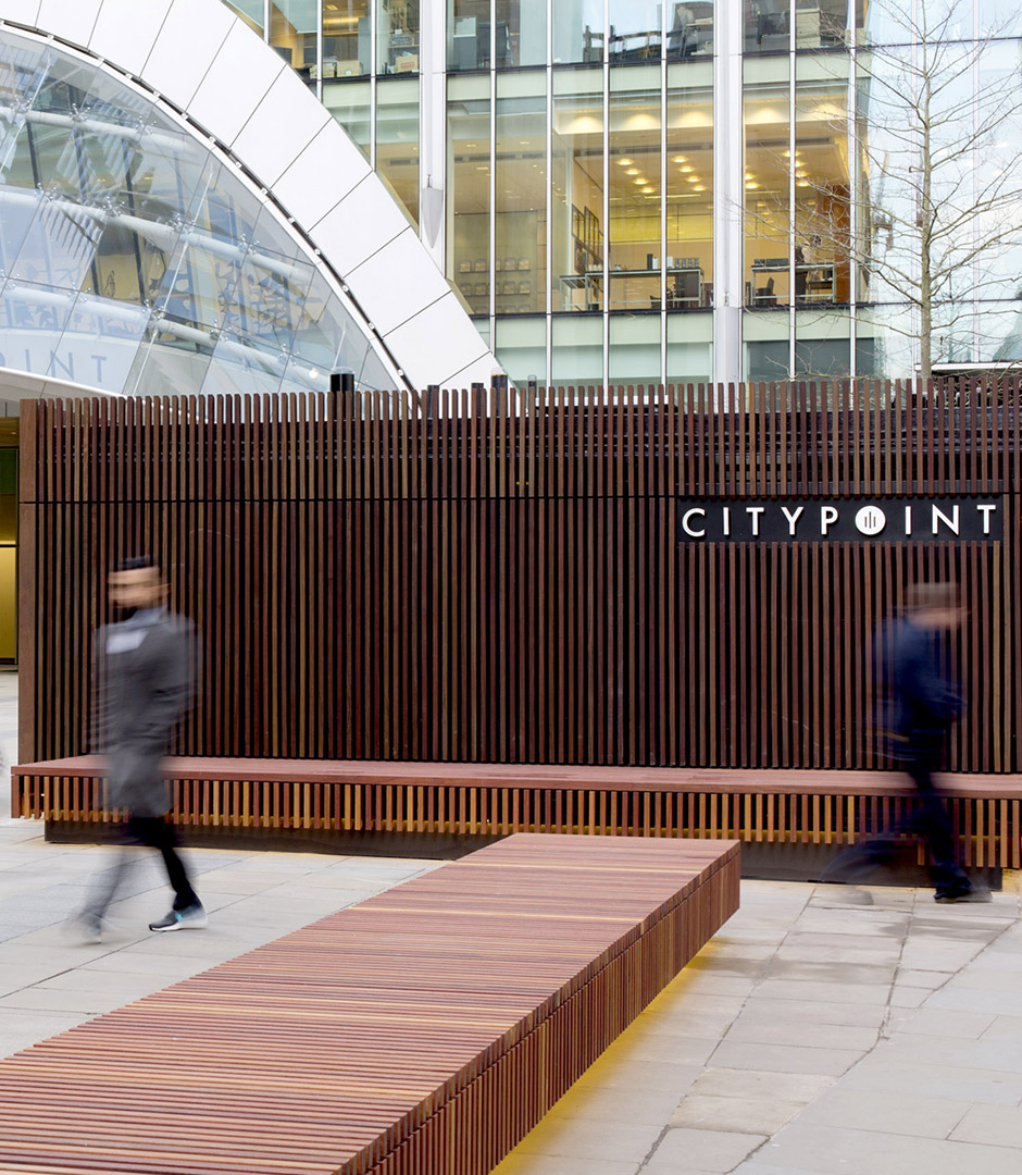 VH Electrical carried out Installation of new bespoke LED lighting to City Point Plaza public space in London. The works included new lighting to street furnishings incorporating seating benches and decking aeras, Coffee shop and landscape planters.