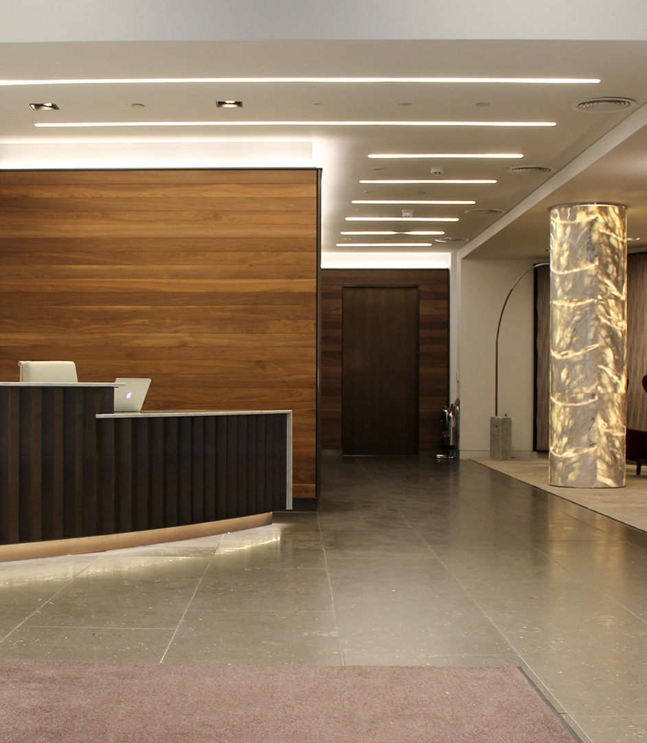 Continuous LED linear lighting was installed to bespoke reception desk and